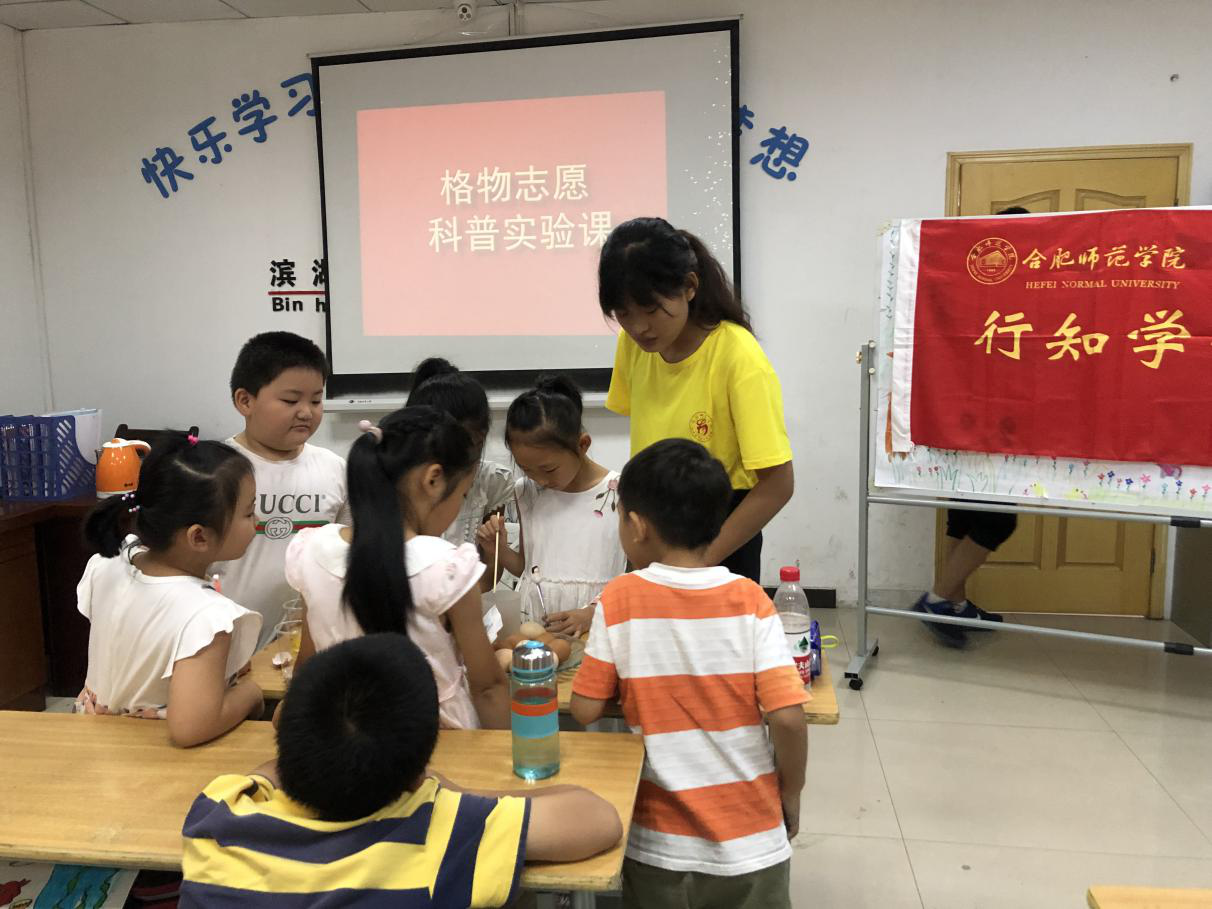 7月9号上午,科普志愿服务队与外国语学院“行知学堂”在合肥滨湖家园居委会进行了首次合作教学,来自tyc5997太阳集团、外国语学院、艺术与传媒学院等9名小先生带着小学员们进行了一次趣味十足的科普实验课。