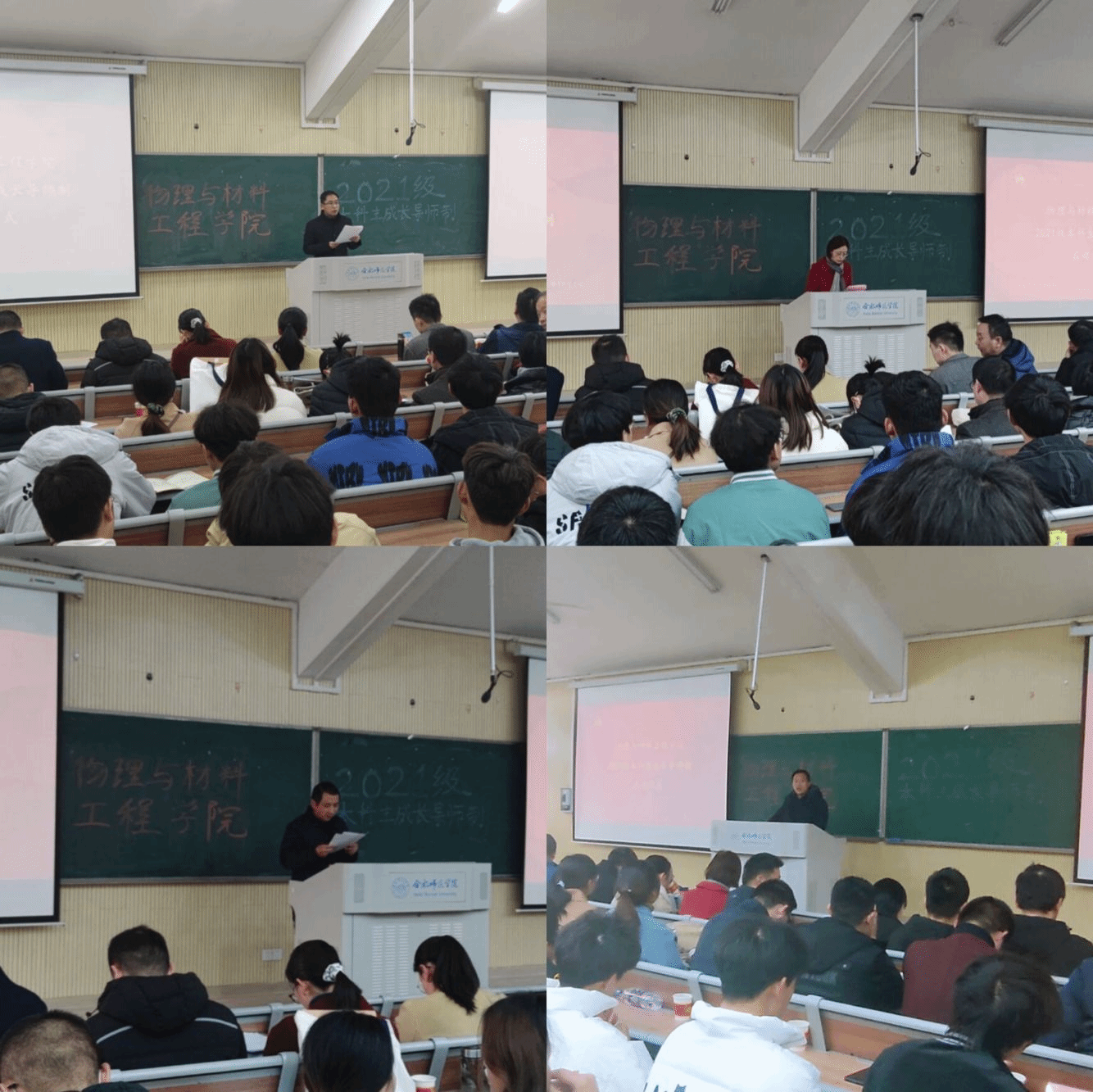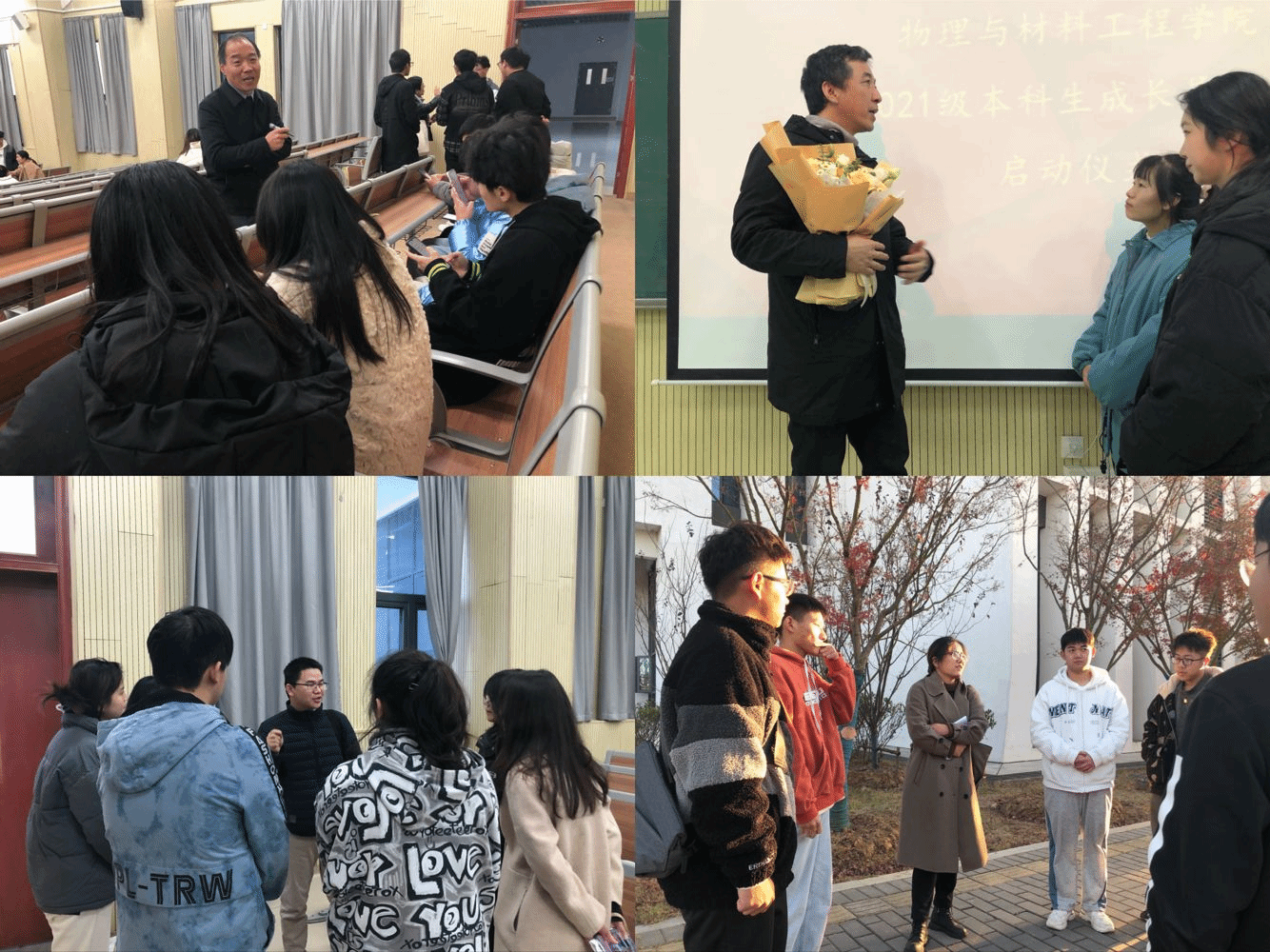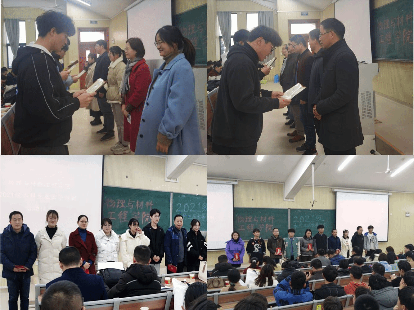 启动仪式上,光信息科学与工程系主任余龙宝、新能源材料与器件系主任訾振发、物理学系主任李冬鹏、材料科学与工程系主任王琳分别宣读了各专业的导师名单及对应指导的学生名单。随后各专业老师分组上台,接受学生代表诵读拜师词、呈送拜师帖、行拜师礼。