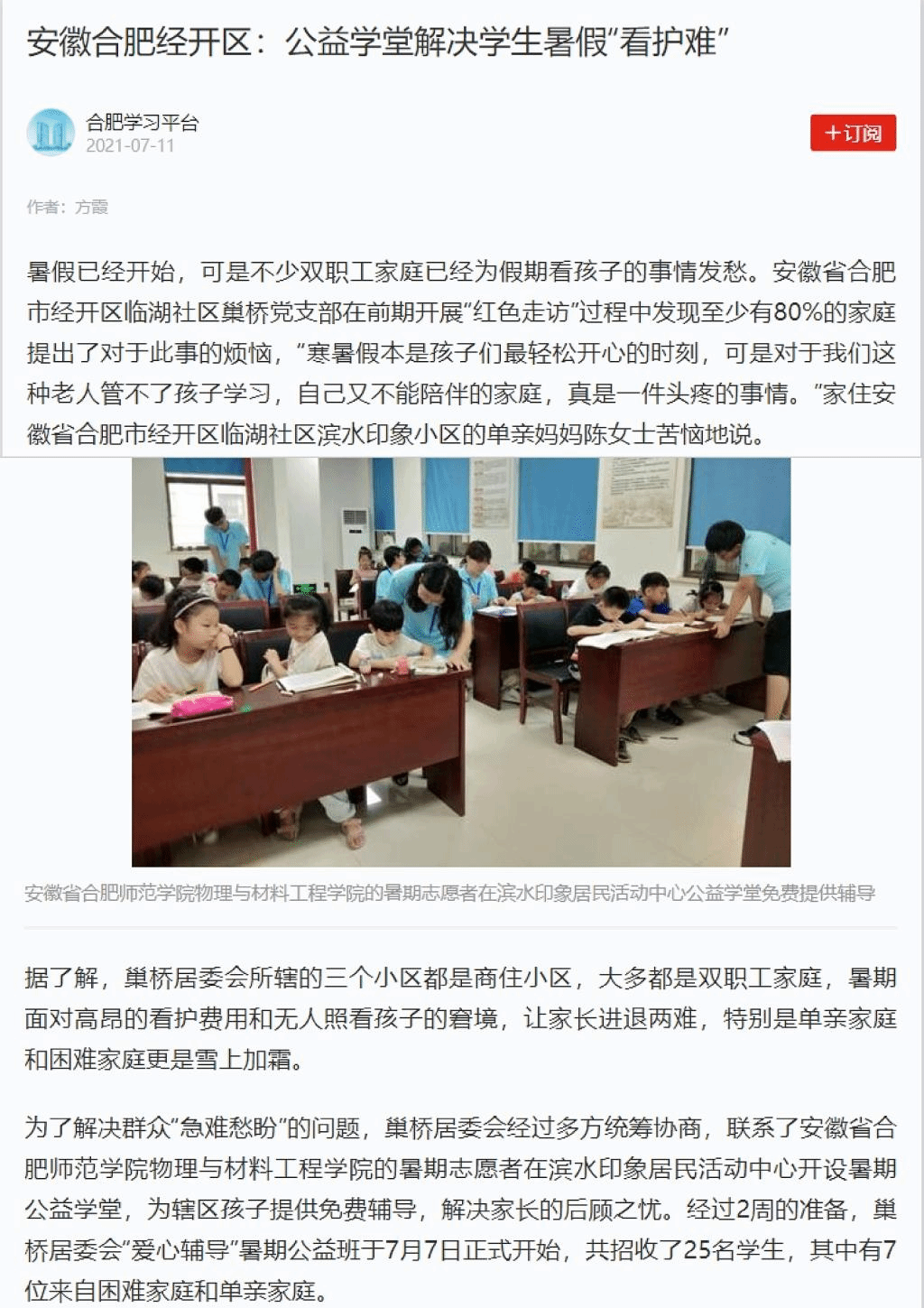 新闻链接:安徽合肥经开区:公益学堂解决学生暑假“看护难” (xuexi.cn)