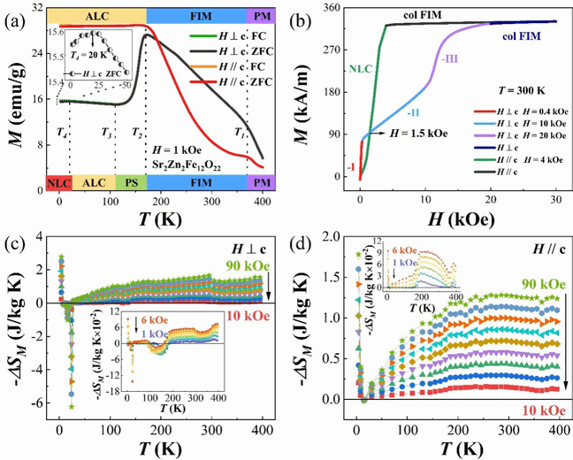 磁热效应作为磁性材料的内禀属性,通常会反映出材料内部的磁相变行为。而磁制冷技术则是基于材料的磁热效应,在民生、军事、大科学装置等领域均具有非常广阔的应用前景。本研究工作采用助熔剂法成功制备出Y型六角铁氧体Sr2Zn2Fe12O22晶体,并发现其在2-400 K宽温域存在多种磁相变诱导的多元磁热效应。此外,Sr2Zn2Fe12O22晶体因具有较强的磁晶各向异性也展现了突出的各向异性磁热效应。以上研究结果表明,Y型六角铁氧体Sr2Zn2Fe12O22晶体是一类可在宽温域工作的多功能磁制冷材料,非常适用于研发未来在综合极端条件下应用的磁制冷技术。