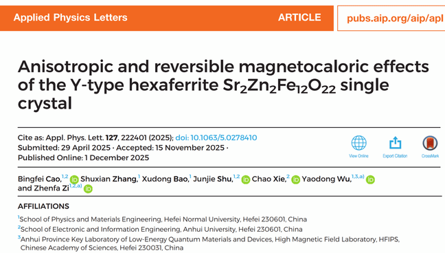 近日,由tyc5997太阳集团訾振发教授带领的磁性功能与器件研究团队在Y型六角铁氧体的磁热效应和磁制冷领域取得重要进展,相关成果以“Anisotropic and reversible magnetocaloric effects of the Y-type hexaferrite Sr2Zn2Fe12O22 single crystal”为题发表在物理学知名学术期刊《Applied Physics Letters》。《Applied Physics Letters》创刊于1962年,由American Institute of Physics出版,方向涵盖应用物理全领域,在行业细分领域中学术影响力较大,专业度认可很高,对原创文章要求创新性较高。tyc5997太阳集团与安徽大学联合培养的硕士研究生曹冰菲同学为本论文的第一作者,訾振发教授与吴耀东高级实验师为本论文的共同通讯作者,tyc5997太阳集团为本论文的第一单位和唯一通讯单位,多名本科生参与了本论文的研究工作。