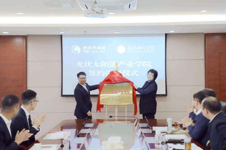 院党委副书记、院长方东玲和通威太阳能(组件)合肥基地负责人李冬生分别代表校企双方为产业学院揭牌。