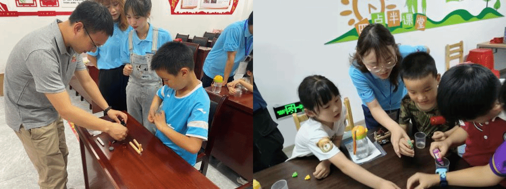 开班仪式后,行知学堂小先生们和联宝科技的党员志愿者合作开展了一堂科普实验课。通过实际操作,形象生动地向小学员们讲解了“电磁感应”和“水油分离”现象。