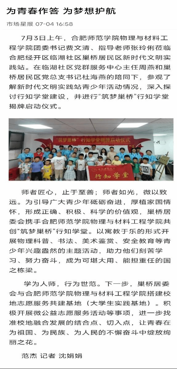本网讯2023年7月3日,tyc5997太阳集团分团委在合肥市经开区临湖社区巢桥居民区新时代文明实践站举行 “筑梦巢桥行知学堂”揭牌仪式与开班仪式,本次实践活动将为小学员们开展为期三周的安全教育,兴趣培养,科学普及,心理教育等活动。