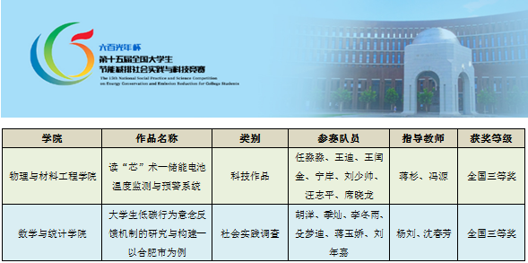 日前,“六百光年杯”第十五届全国大学生节能减排社会实践与科技竞赛在天津大学落下帷幕,我校本科生团队的两件作品分别获得全国三等奖,其中蒋杉与冯源老师指导、任淼淼等同学的作品“读‘芯’术—储能电池温度监测与预警系统”获科技作品类三等奖,杨刘与沈春芳老师指导、胡洋等同学的作品“大学生低碳行为意念反馈机制的研究与构建—以合肥市为例”获社会实践调查类三等奖。