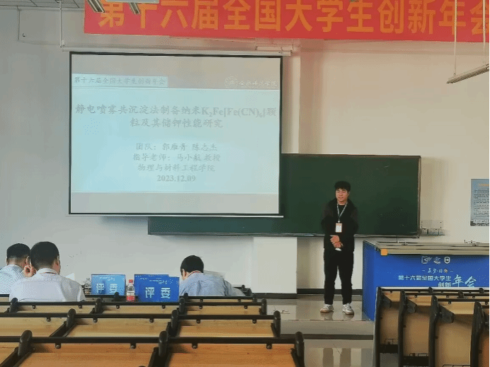第十六届全国大学生创新年会于12月8日至10日在海南大学举行,我校tyc5997太阳集团大学生创新训练计划项目“普鲁士蓝类钾离子电池正极材料的合成及电化学性能表征”(项目成员:郭雁青、陈志杰等,指导教师:马小航、张天文)相关成果成功入围全国年会学术论文,并以“静电喷雾共沉淀法制备纳米K2Fe[Fe(CN)6]颗粒及其储钾性能研究”为题进行了成果汇报交流。