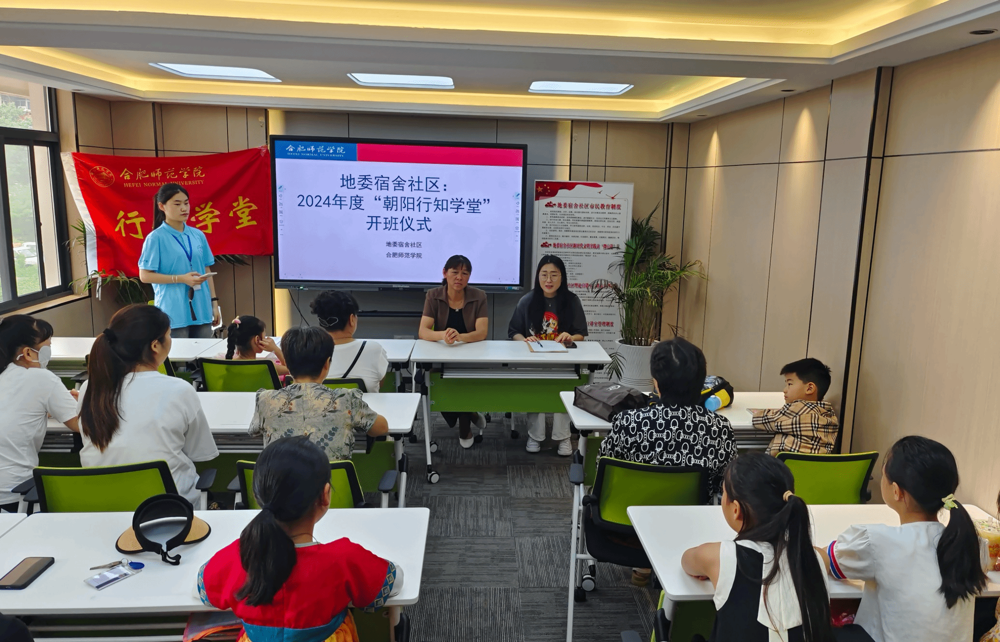 7月15日,tyc5997太阳集团“朝阳行知学堂”在蚌埠市地委宿舍社区党群服务中心举行开班仪式。社区党委副书记陈雨梦、行知学堂指导老师李妍、12名小先生和全体小学员及家长共同参加了开班仪式。开班仪式由学堂负责人岳安琪主持。
