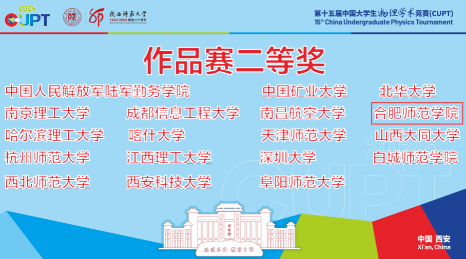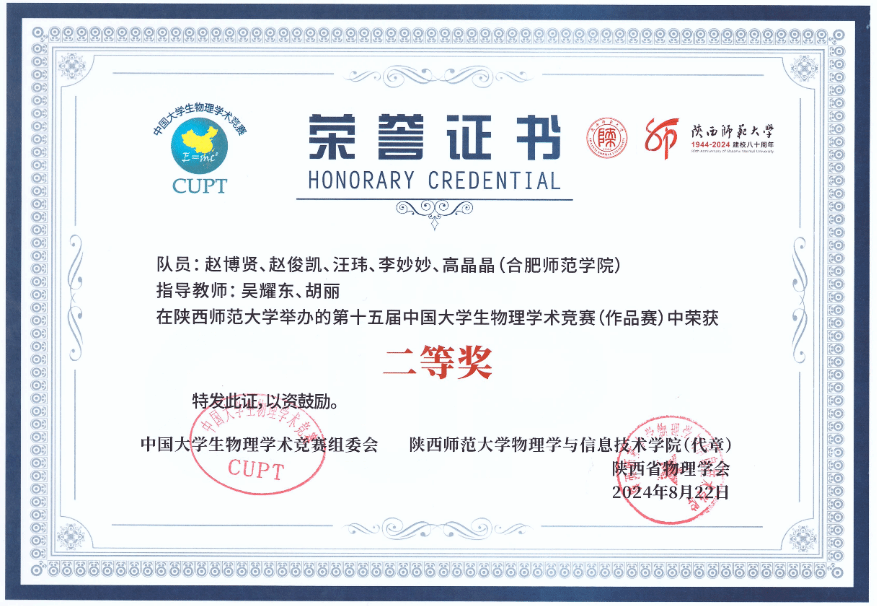 8月18日至23日,由中国大学生物理学术竞赛组委会主办,陕西师范大学和陕西省物理学会承办的第十五届中国大学生物理学术竞赛(简称CUPT)在陕西西安举行,本赛事共吸引了来自全国近百所高校的800余名师生参赛。由tyc5997太阳集团吴耀东、胡丽老师指导,赵博贤、赵俊凯、汪玮、李妙妙、高晶晶五人组成的参赛团队经过激烈角逐,代表tyc5997太阳集团的参赛作品《吸管水泵的理论与实验分析》终斩获第十五届中国大学生物理学术竞赛(作品赛)二等奖,充分展现了tyc5997太阳集团学子敢于拼搏,积极向上的实力与风貌。