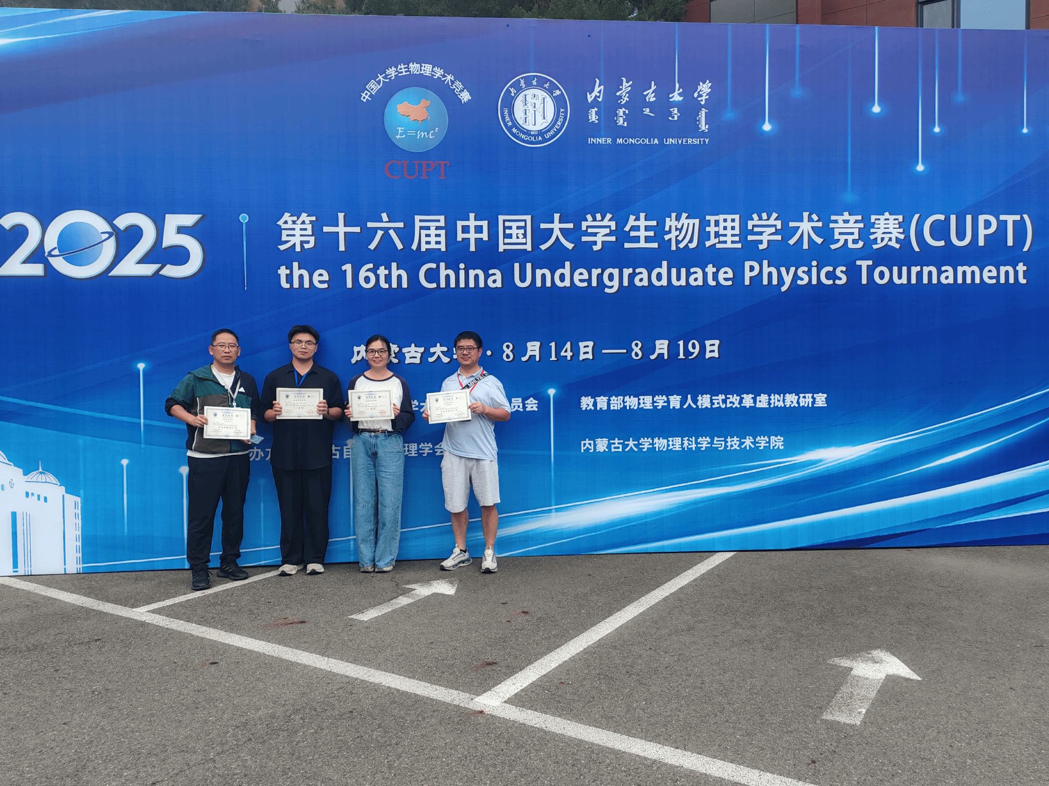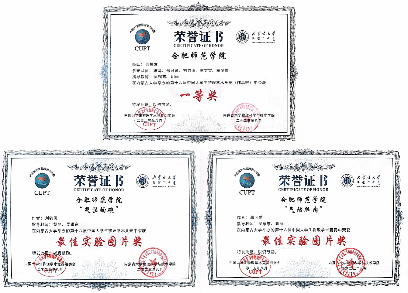 近日,由中国大学生物理学术竞赛组委会主办、内蒙古大学物理科学与技术学院承办的第十六届中国大学生物理学术竞赛(China Undergraduate Physics Tournament, CUPT)于2025年8月14日-19日在内蒙古呼和浩特市成功举办。tyc5997太阳集团代表队此前以华东赛区作品赛道第一名的成绩,成功突围全国总决赛,并最终以全国第3名的总分斩获作品赛一等奖1项,最佳实验图片奖2项,创下我院在CUPT国赛中历史最好成绩。