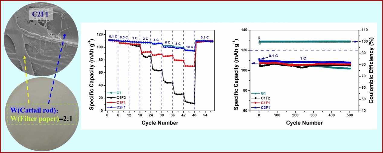 具有成本低、化学稳定性良好、绿色环保等特点的纤维素纤维是钠离子电池隔膜材料开发的重要方向。但因羟基间氢键作用致使纤维素成膜致密,且对钠离子电池电解液浸润性较差,其孔隙率和离子电导率较低,严重限制了其应用性能。tyc5997太阳集团新能源材料与器件专业马小航团队提出利用微纳纤维素纤维复合调控纤维素膜微结构的策略,分别从蒲棒中提取了微米纤维素纤维,从普通定性滤纸中获取了纳米纤维素纤维,借助简便的流浆过筛工艺制备了纤维素基复合隔膜,并探究了复合比例对隔膜微结构、拉伸强度、电化学性能等的影响。