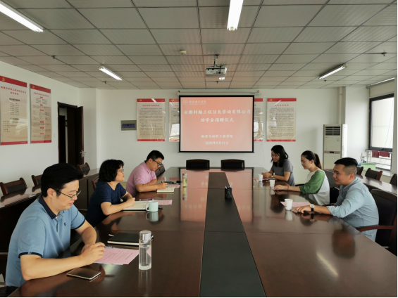 9月11日下午,tyc5997太阳集团与安徽梓翰信息工程咨询有限公司举行梓翰助学金捐赠仪式。安徽梓翰工程信息咨询有限公司总经理胡毅一行,物材学院党总支书记唐洁、副院长李大创和相关老师参加捐赠仪式。仪式由党总支副书记吴震主持。