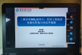 9月3日晚20:00,tyc5997太阳集团张钧君博士借助腾讯会议线上平台,做了“二维层状MX2纳米片:层间工程助力电催化析氢与电化学储能”的学术报告,材料科学与工程专业学生聆听了报告。