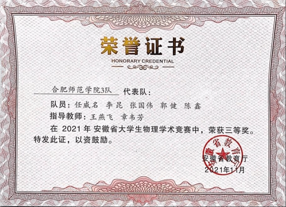 日前,安徽省教育厅公布了2021年安徽省大学生物理学术竞赛(CUPT)结果,我校2019级物理学专业和新能源与器件专业任威名、李昆、张国伟、郭健、陈鑫同学联合组成的代表队荣获三等奖,2019物理学专业梅凯运、邰贵宝、章婷婷、李哲、王超组成的代表队获得优秀奖。