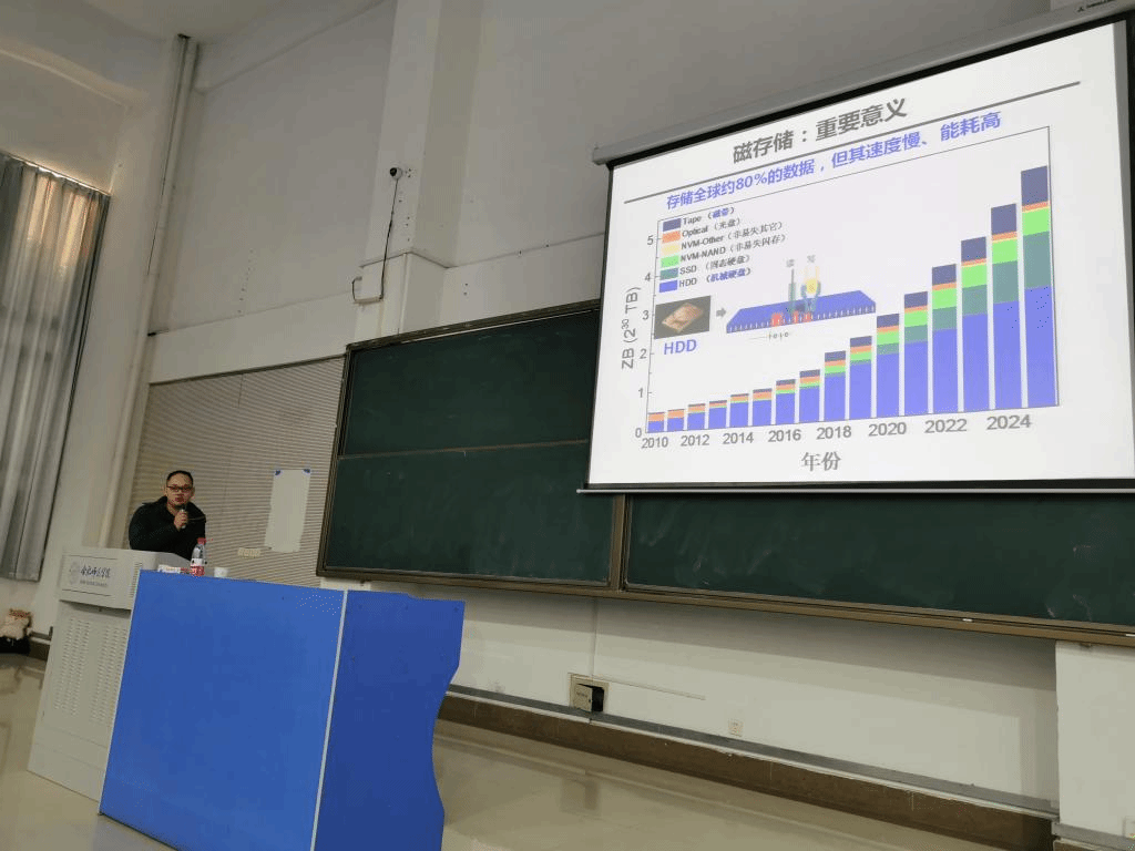 来自中国科学院合肥物质科学研究院强磁场科学中心的汤进研究员做了“透射电镜原位磁畴研究”的报告。汤研究员的研究团队利用聚焦离子束微纳加工技术制备纳米条带器件,通过零磁场对斯格明子和螺旋磁畴混合态反转磁场的方法,成功在实验上实现了新型“磁束子”拓扑磁结构,首次发现多拓扑荷特性“磁束子”,将拓扑磁电子学研究对象从单位拓扑荷扩展到多拓扑荷,揭示了磁性材料中拓扑磁结构的多样性,为未来开发多态存储、逻辑及信息处理器件提供了新的数据载体研究对象。